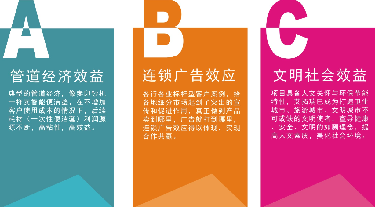 艾拓瑞(iTOILET)智能便潔墊的問世,大大改善了廁所衛(wèi)生現(xiàn)狀,艾拓瑞(iTOILET)智能便潔墊強調(diào)的是徹底解決坐墊衛(wèi)生問題,用前輕輕一按,自動切換一次性坐墊,簡單快捷,環(huán)保節(jié)能。更適用于酒店賓館、醫(yī)院會所、美容美體、機場碼頭、寫字樓等公共場所及家庭客廳衛(wèi)生間的馬桶配套使用。馬桶安全套,衛(wèi)生又環(huán)保。一人一廁,方便再無后"股"之憂!典型的朝陽產(chǎn)業(yè),未來趨勢;市場巨大,前景無限!