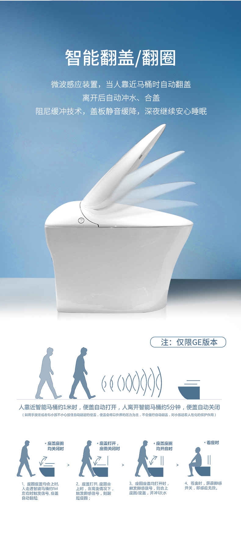 產(chǎn)品功能:1、微波感應(yīng)、自動(dòng)翻蓋/翻圈、